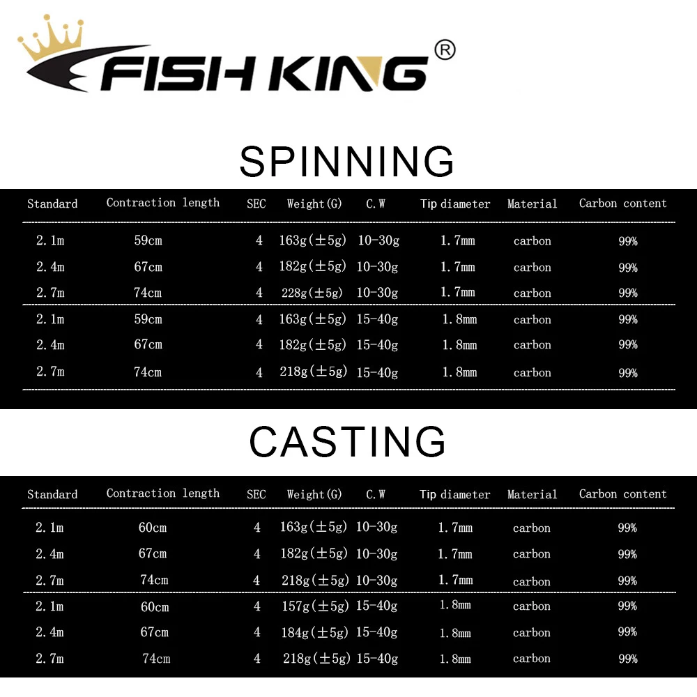 Buy FISH KING Carbon Spinning BaitCasting Fishing Rod 2.1m/2.4m/2.7m C.W 10-30g/15-40g 4 Section Lure R Right Here and Right Now Just for USD US $26.31, Price will be rise up at any time without notification and I cant guaranted that the stock is still available tommorow or next hour. So Please Save It Now!